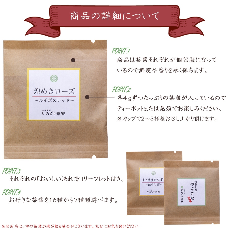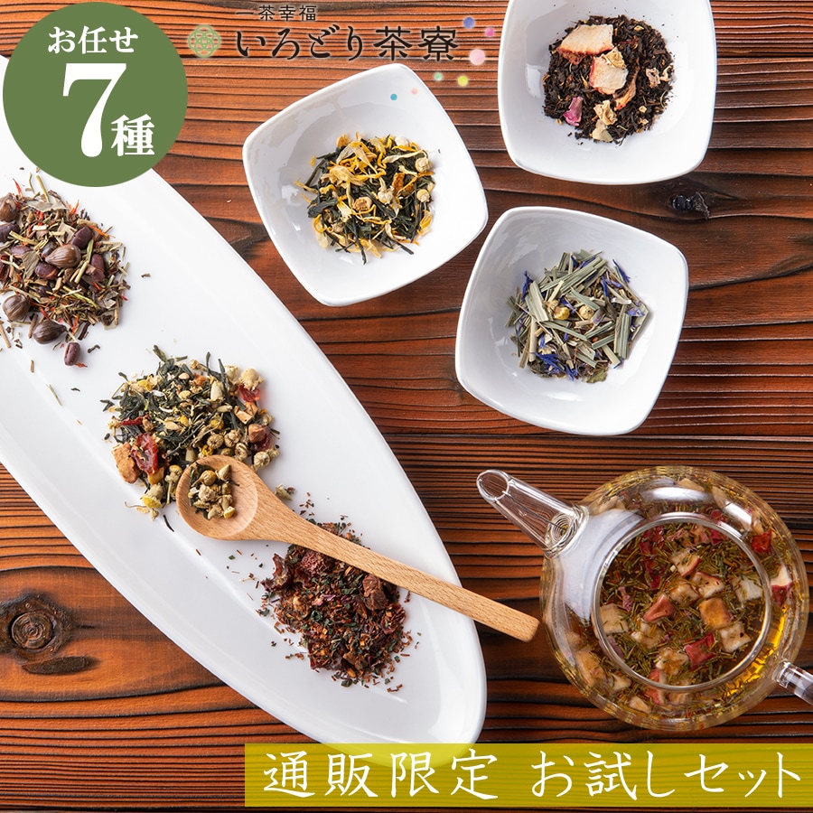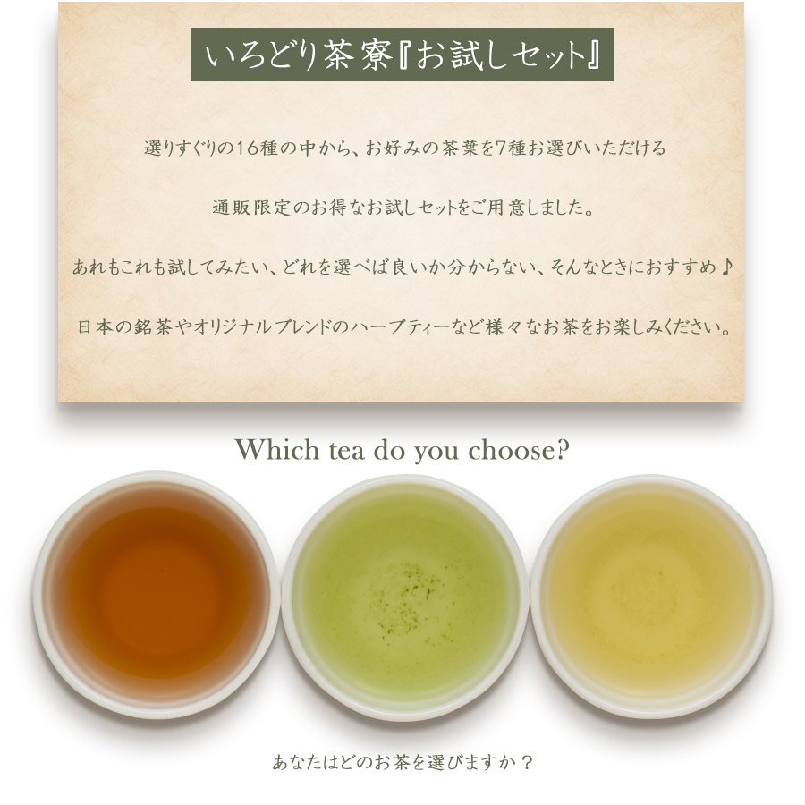 いろどり茶寮の『お試しセット』は、選りすぐりの16種類の茶葉の中から、お好みの7種を選べるお得なセット。通販限定で、税込1,000円(926円+税)でお楽しみいただけます。