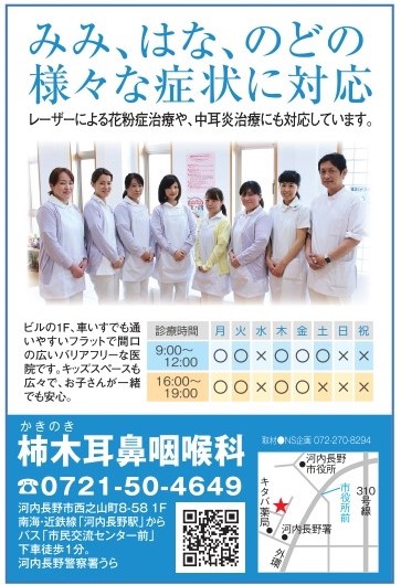 河内長野市の みみ、はな、のどの様々な症状に対応している「柿木耳鼻咽喉科」