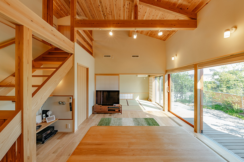 勾配天井が開放的なLDKは家族が集まる場所に。