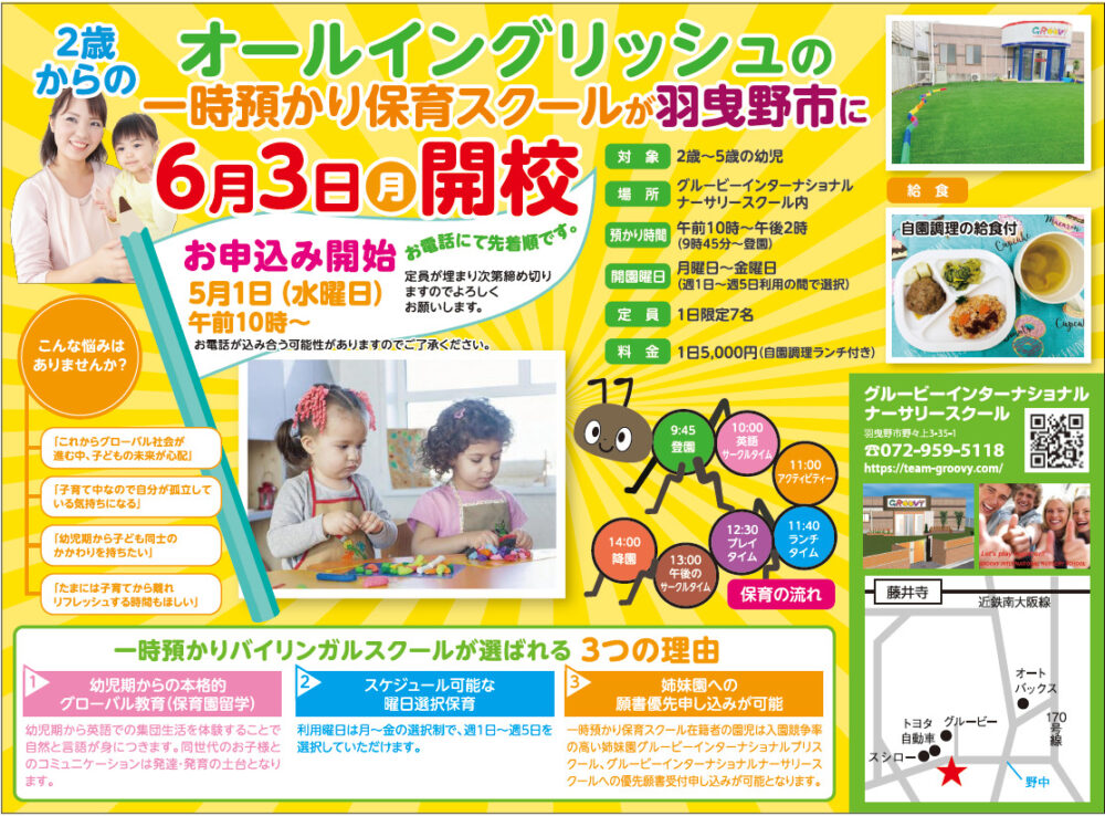 羽曳野市の人気保育園「グルービーインターナショナルナーサリースクール」内に、