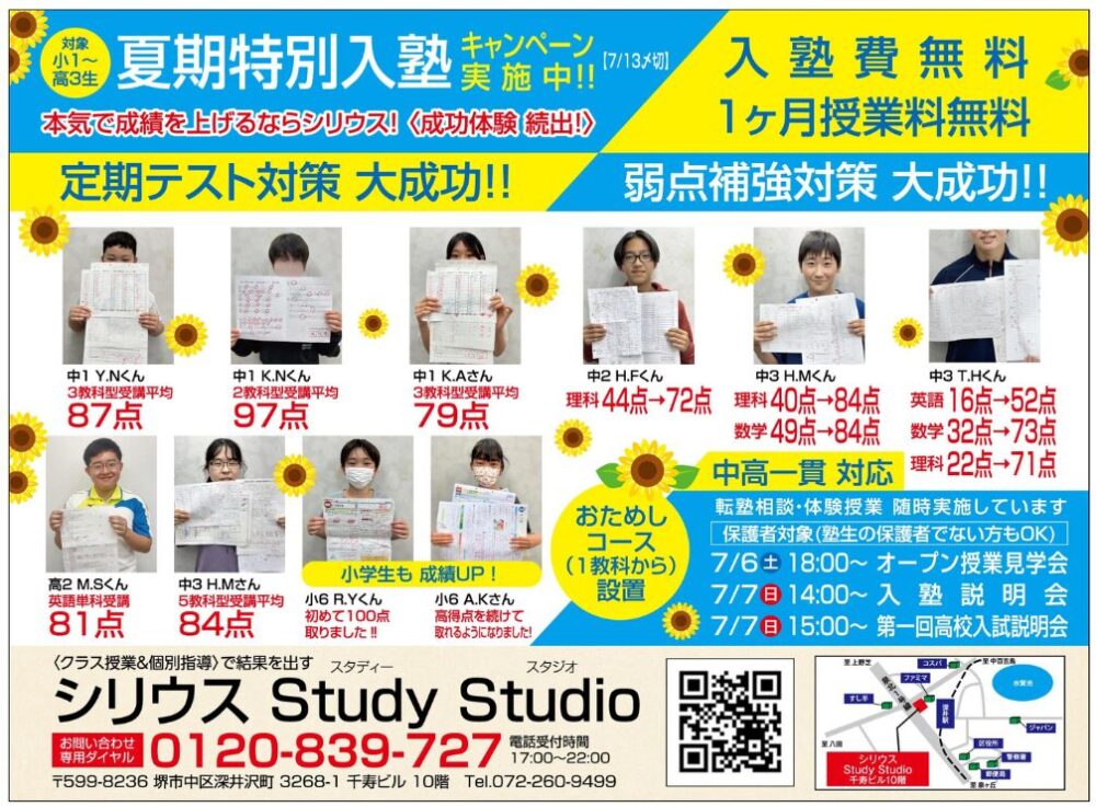 7月6日(土)・7日(日)には保護者対象の説明会や見学会も実施していますので、通塾をお考えの方は一度お問合せしてみてはいかかでしょうか^^