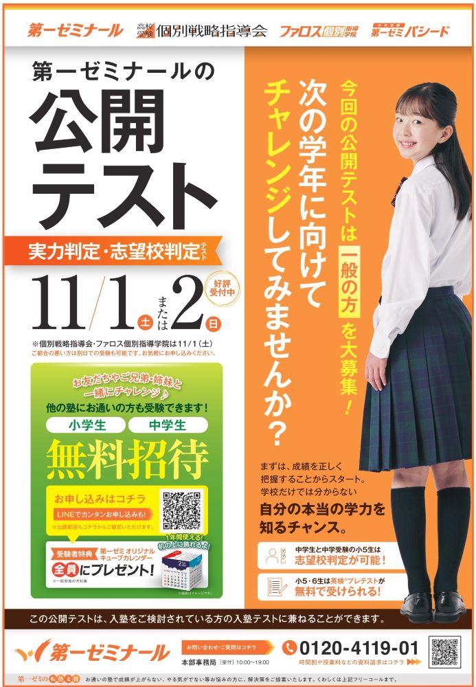 小学生・中学生に向けて、第一ゼミナールさんが公開テストを無料で開催します!