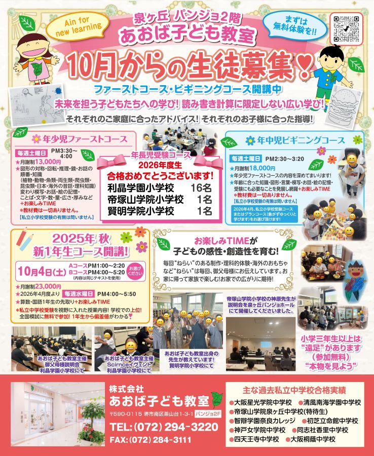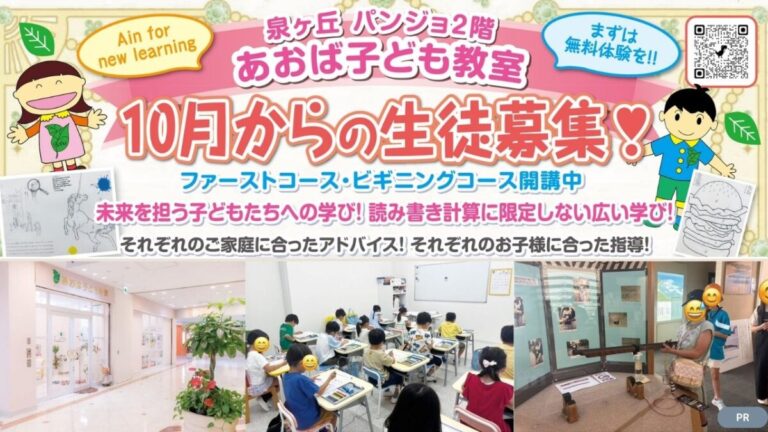 堺市南区茶山台、泉ヶ丘バンジョ2階にある『あおば子ども教室』が、2025年10月からの生徒を募集しています。
