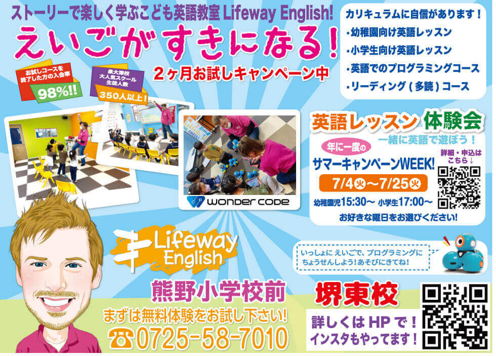 熊野小学校前にある「Lifeway English 堺東校」では2ヶ月お試しキャンペーンを実施中です。