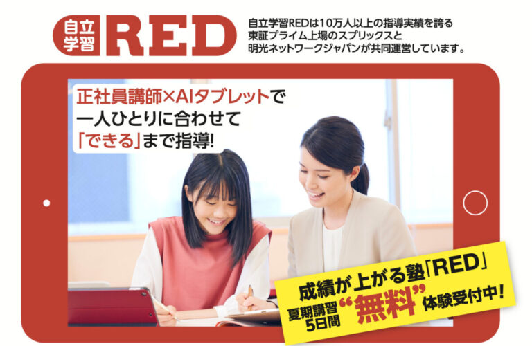 自立学習REDは、10万人以上の指導実績を誇る東証プライム上場のスプリックスと明光ネットワークジャパンが共同運営する塾です。