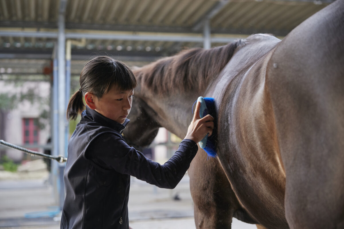 スマホの利用やゲームに勉強、子供たちは前傾ぎみな環境の中で過ごしています。馬に乗るにはピンとした真っ直ぐな姿勢が必要。開放的な乗馬クラブに来たら遠くの景色を眺めながら目線を上げ、姿勢よく馬に乗ります。馬を世話するときもいつも顔を上げて馬にふれます。上手になりたい子は普段の生活の中でも姿勢を意識するようになります。乗馬で姿勢矯正できるのもステキな効果です。