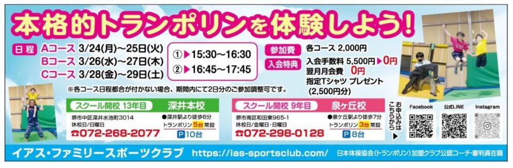 堺市中区と堺市南区にある『イアス・ファミリースポーツクラブ』でトランポリンを体験してみませんか?