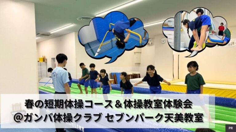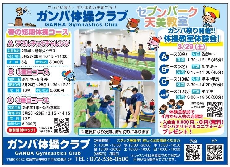 松原市のセブンパーク天美内にある 「ガンバ体操クラブ セブンパーク天美教室」では、春の短期体操コース&体操教室体験会「ガンバ祭り」を開催します☆