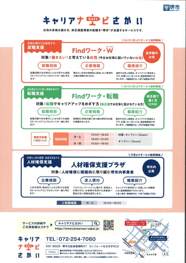 女性の多様な働き方、非正規雇用者の転職を堺市が支援するサービスとして、