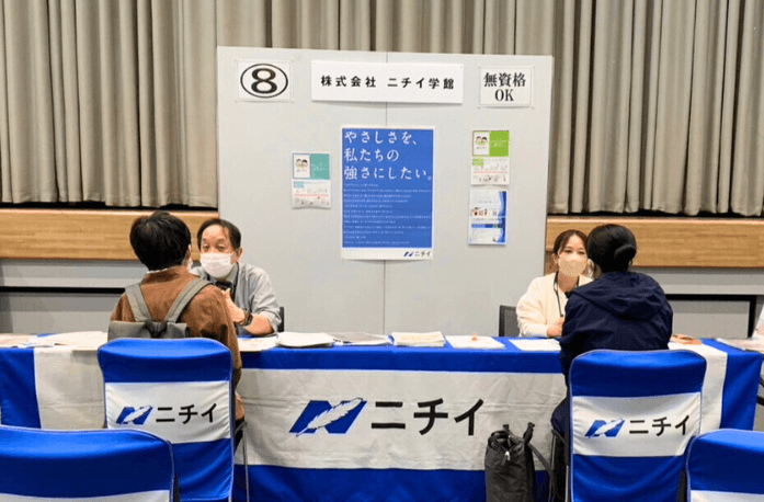 来場された皆様は、会場に設置している求人票や勤務予定地をチェックした後、積極的に採用担当の方からお話を聞かれていました。