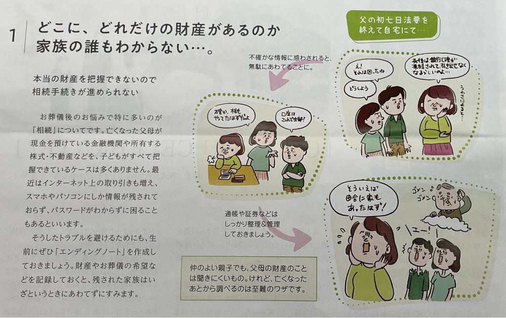 お葬儀後のお悩みで特に多いのが「相続」についてです。亡くなった父母が現金を預けている金融機関や所有する株式・不動産などを、子どもがすべて把握できているケースは多くありません。最近はインターネット上の取り引きも増え、スマホやパソコンにしか情報が残されておらず、パスワードが分からずに困ることもあるといいます。