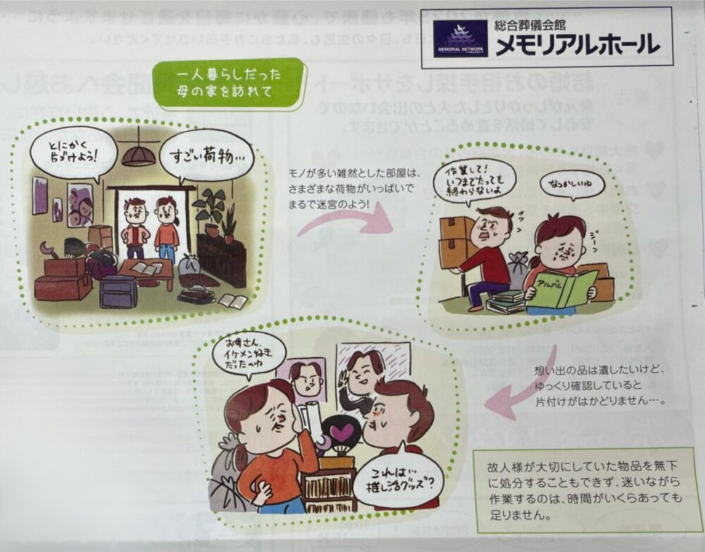 お葬儀後のさまざまな手続きに追われる中、住まいや遺品の整理も後まわしにすることはできません。とはいえ、故人様が最期まで暮らした住まいには、面影や思い出の残る遺品がいっぱい。大切なものを選別しながら、効率よく整理するのは大変です。