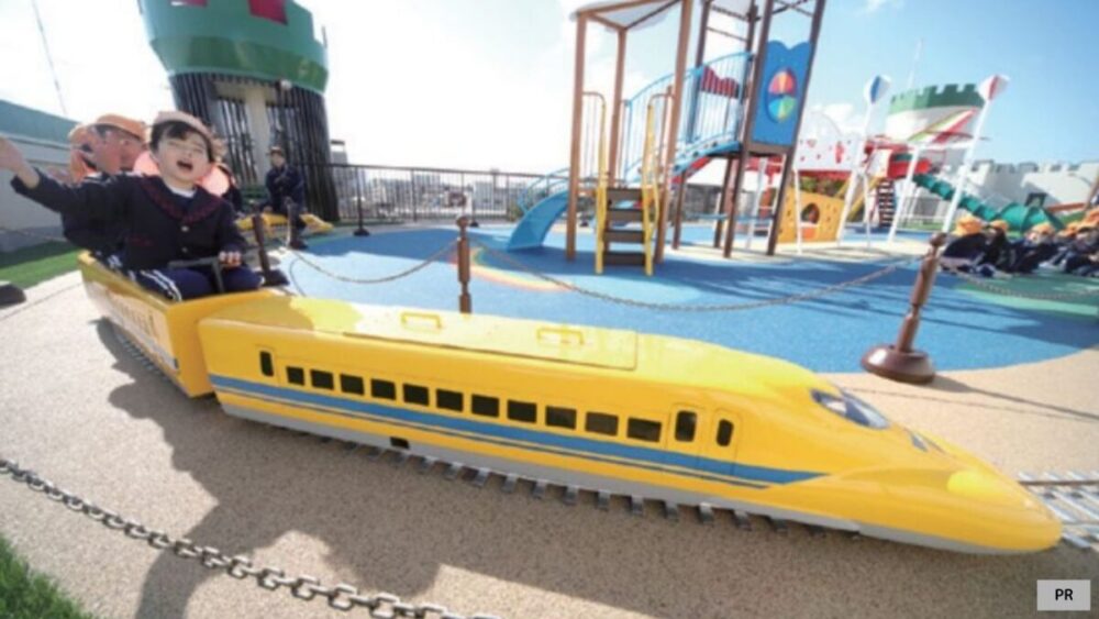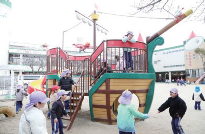 園庭に機首を向け、今にも飛びたとうとする真っ赤な飛行機。子どもたちの夢を乗せ、屋上を一周する新幹線ドクターイエロー。園庭屋上はカラフルで色鮮やかな「にじいろスカイガーデン」です。心弾むひととき、園児の笑顔と歓声があふれています。