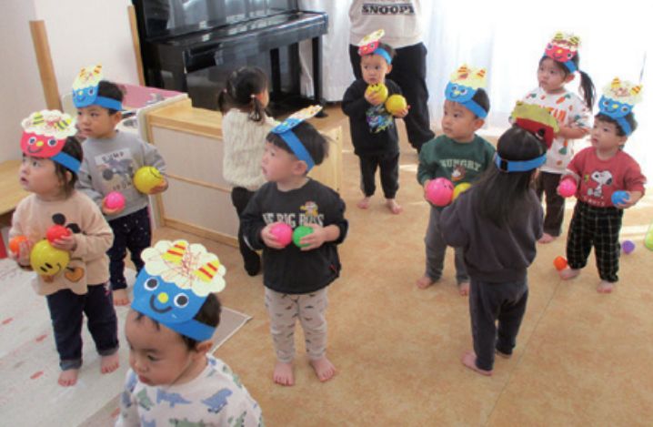 ▲1歳児さんもボールを使ってオニ退治をしました。みんながすくすく大きくなりますように♪