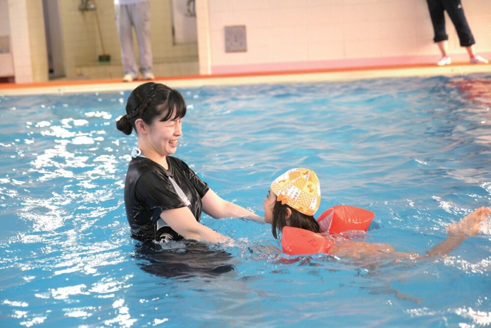 【スイミング教室】 専門コーチと楽しく園内の温水プールで、体力づくりと基本的なスイミングを学びます。