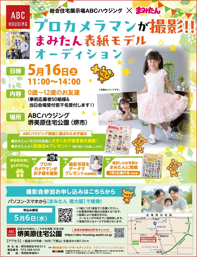 堺市美原区にある「ABCハウジング 堺美原住宅公園」で、情報誌「まみたん」とのコラボ企画『プロカメラマンが撮影!! まみたん表紙モデルオーディション』が開催されるんです!