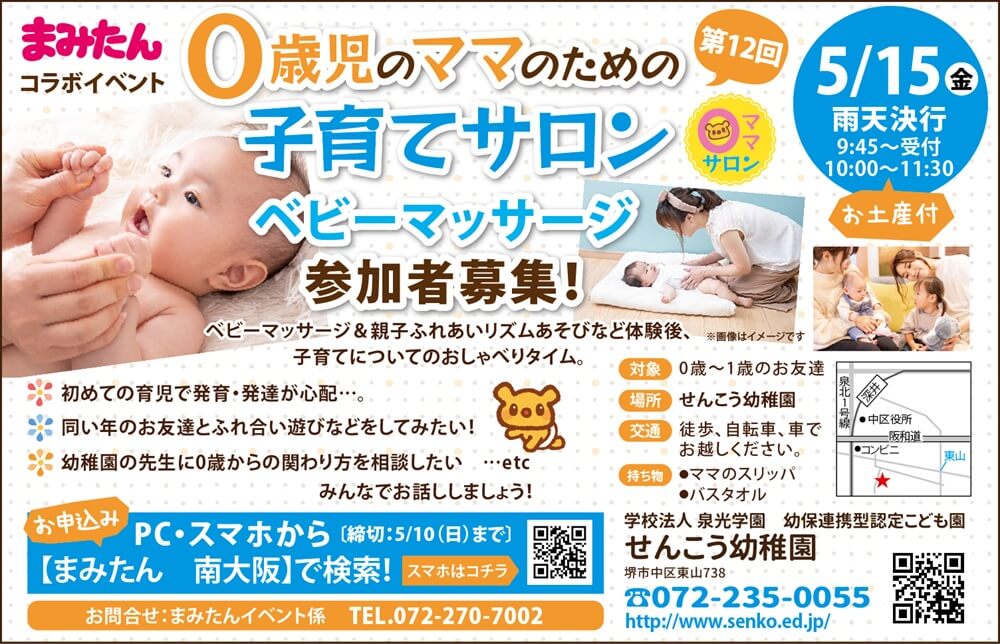 0歳児ママにぴったりのイベント『第12回 子育てサロン ベビーマッサージ』が、堺市中区の「せんこう幼稚園」で開催されます!