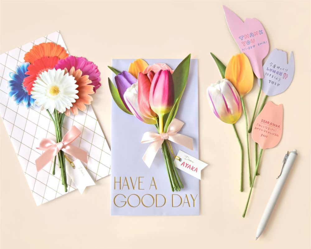 それぞれの花のカードにメッセージを書いて、束ねて花束のように贈る寄せ書きカードです!