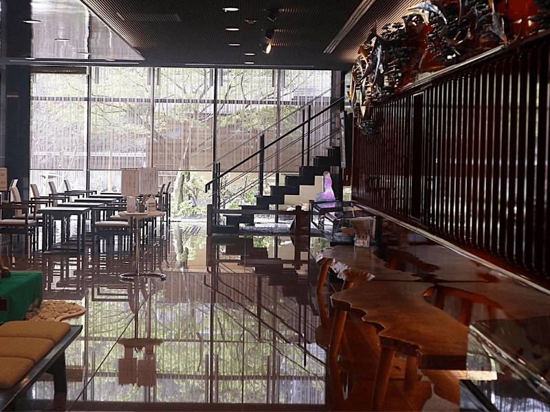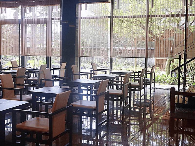 遠くからでもわかる大きなガラス張り、その景色は茶室のある日本庭園です!