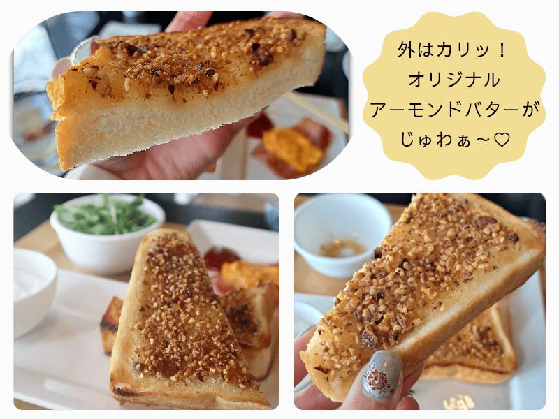 カリッと香ばしく焼いた食パンにしっかりしみ込んだアーモンドバター、