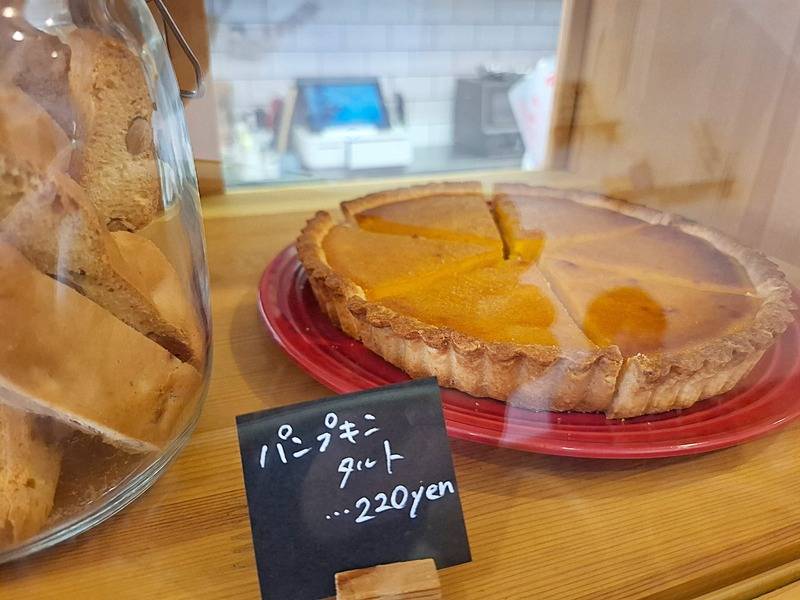 カウンター上のショーケースには焼き菓子が並び、旬のお野菜を使った「パンプキンタルト」がありました。
