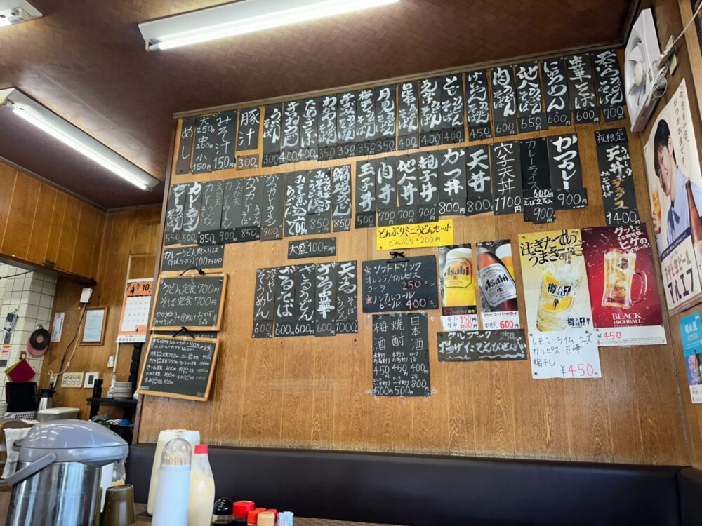 壁面には、味のある書体で書かれたメニューがずらりと飾られ、麺類、定食、丼物、おかずと、その種類の多さに圧倒されます。