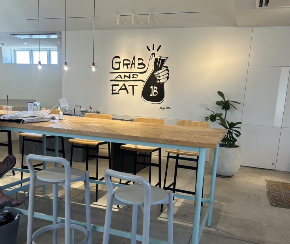 おしゃれなインテリアの中で、購入したてのパンやハンバーガーを味わえます。
