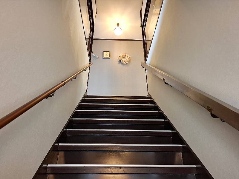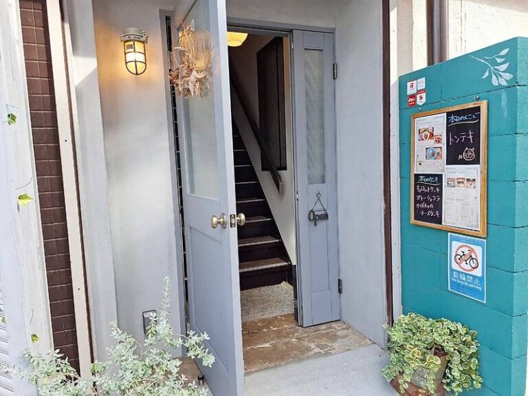 「cafe&nanatsu(ななつ)」は、階段を上った先がすぐに店内に繋がっているんです。