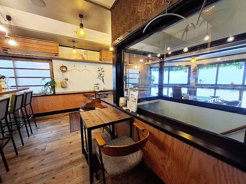 木のテーブルと椅子が用意され、落ち着いた雰囲気の店内。