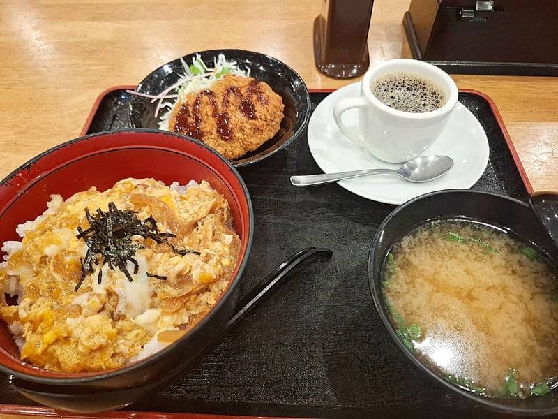 ライターKozuが頼んだ「今日のランチメニュー」は「玉子丼とメンチカツ」です。