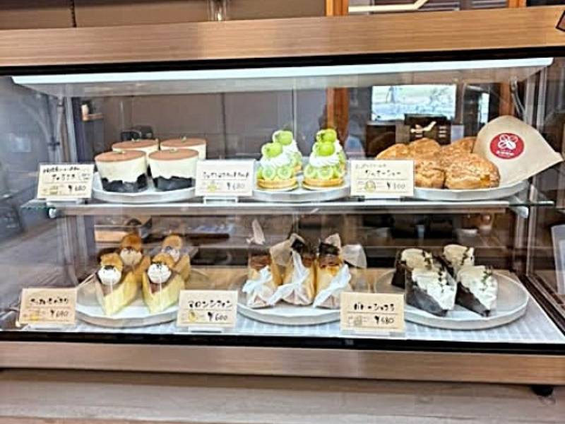 レジ横のケーキケースには、出来立てのケーキやタルトが並んでいますよ♬