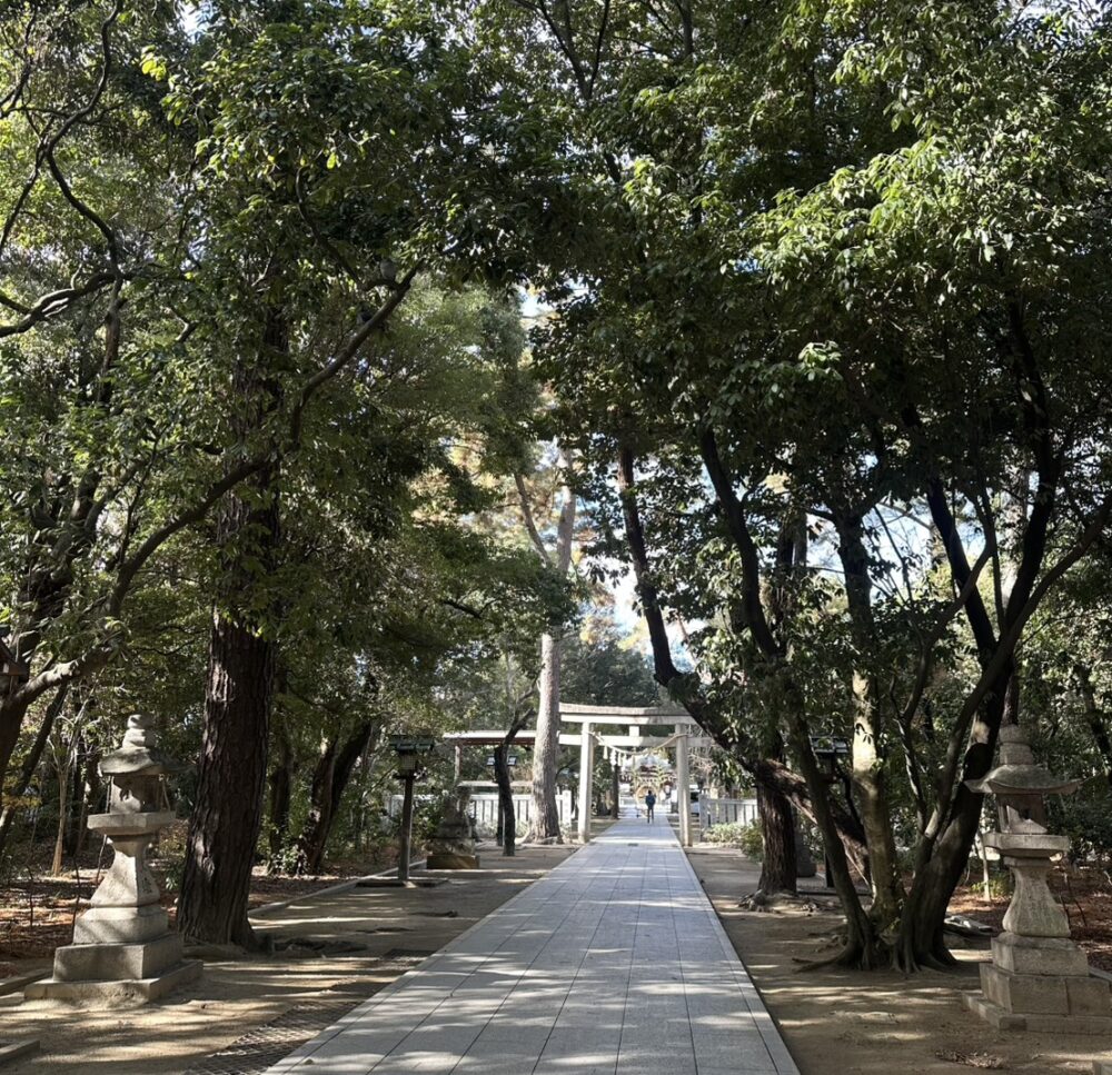 大阪みどりの百選: 鳥居をくぐった瞬間、目の前に真っ直ぐな緑の道が広がります。まるで小さな森に迷い込んだみたいで、歩くだけで心がスッとするんです。
