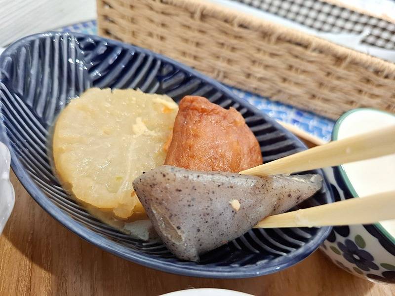 こんにゃく・だいこん・練り物(ウズラ玉子入り)の3種の具材で、熱々の味がしみ込んだおでんです。