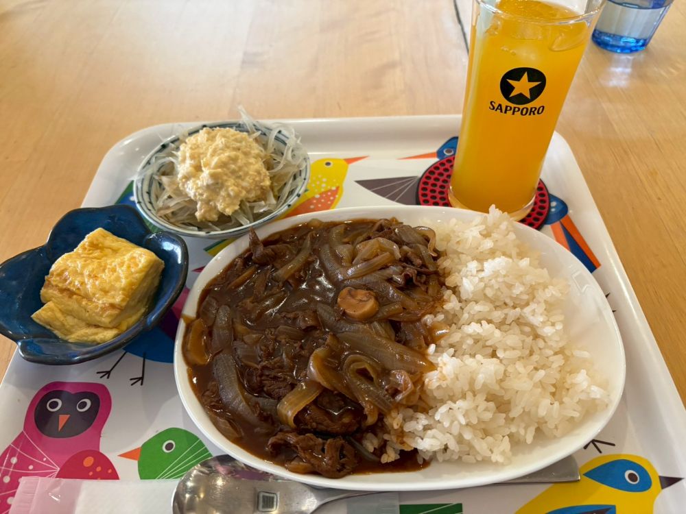 ハヤシライスとだし巻き卵とオニオンサラダとオレンジジュースで、1,000円です(^^)