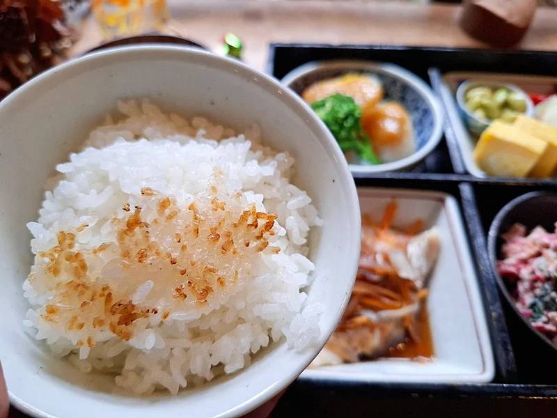 収穫されたお米は昔ながらの釜戸で丁寧に炊き上げられ、ランチで提供されています。