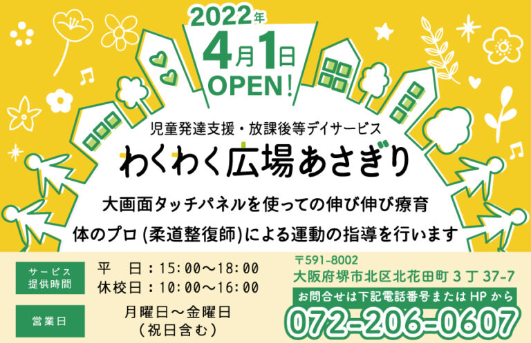 堺市北区北花田に、児童発達支援・放課後等デイサービスの『わくわく広場あさぎり』が4/1(金)にオープンされました!