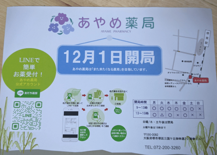 堺東駅から南へ5分ほどの所に2023年12月1日「あやめ薬局」が開局しました。