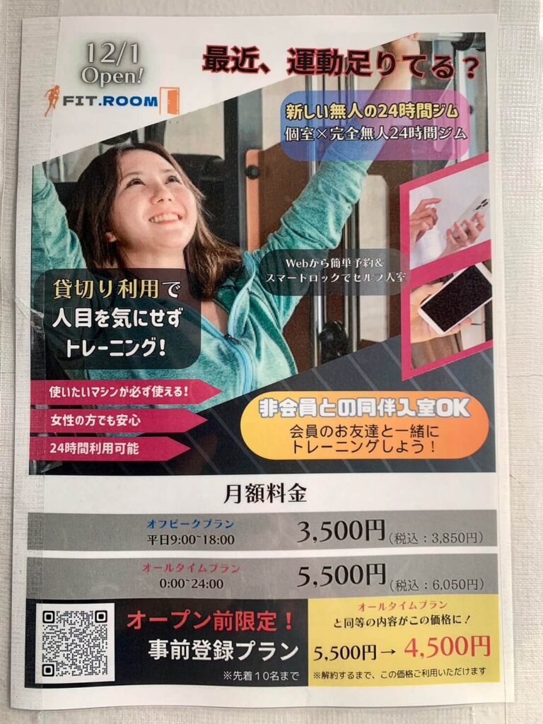 堺市堺区・櫛屋町東に2023年12月1日(金)、あなただけの「プライベートジム空間」を提供してくれる24時間営業&完全無人のトレーニングジム『Fit Room(フィットルーム)櫛屋町東店』がオープンしました♪
