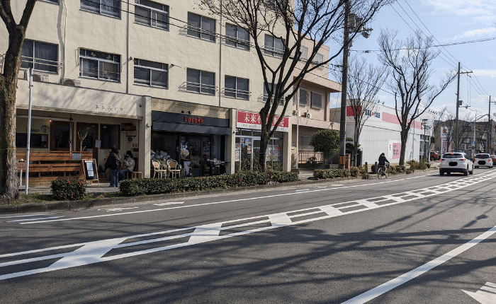 場所は堺市向陵西町のけやき通り沿いで、南隣りには「ココカラファイン」、北隣りにはコーヒーとハンバーグのお店「あおみどり」がある場所です。