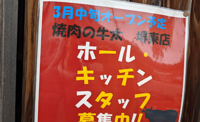 フェニーチェ堺の向かい、堺市堺区中安井町に3月中旬「焼肉の牛太堺東店」がオープン予定ですよ