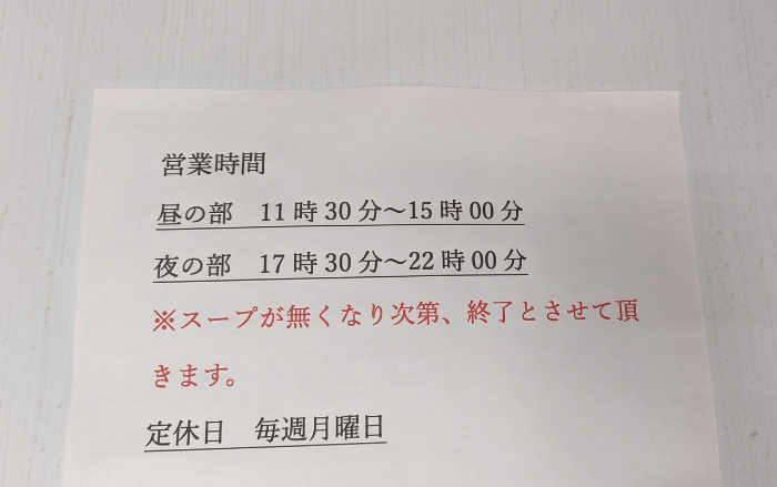 [営業時間]昼の部 11:30~15:00 夜の部 17:30~22:00 ※(スープが無くなり次第終了になります)