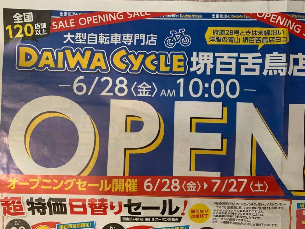 6月28日にときはま線(府道28号線)沿い洋服の青山堺百舌鳥店横に『ダイワサイクル堺百舌鳥店』がオープンしましたよ。