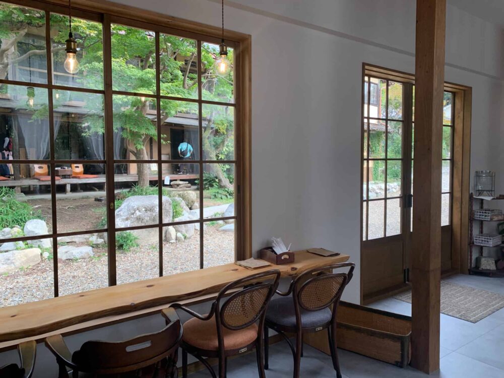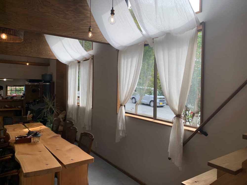 河内材のちゃぶ台、観心寺さんの倒木を利用した一枚板のカウンター、ヴィンテージチェアのリメイクなど、こだわりの家具も居心地が良いです。