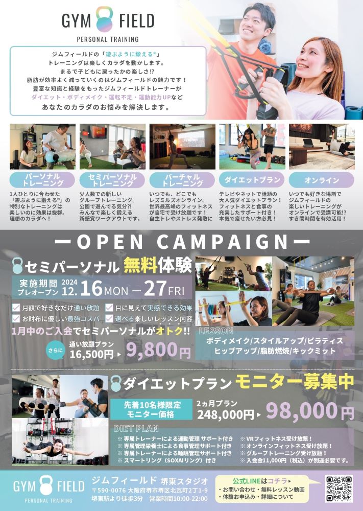2025.1/7(火)、堺市堺区北瓦町にパーソナルトレーニングジム『ジムフィールド堺東スタジオ』がグランドオープンしますよ☆彡