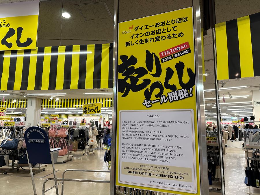 鳳駅から徒歩5分、府道30号線沿いのおおとりウイングスの中にある「ダイエーおおとり店」が2025年1月末に営業を一時終了します。