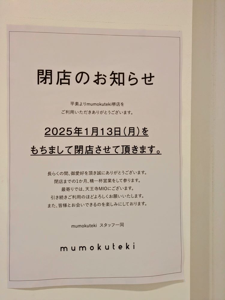 堺市美原区のららぽーと堺1Fにある、ファッション・雑貨・ 食品などを扱っているお店「mumokuteki goods & wears」が残念ながら閉店するそうです・・・