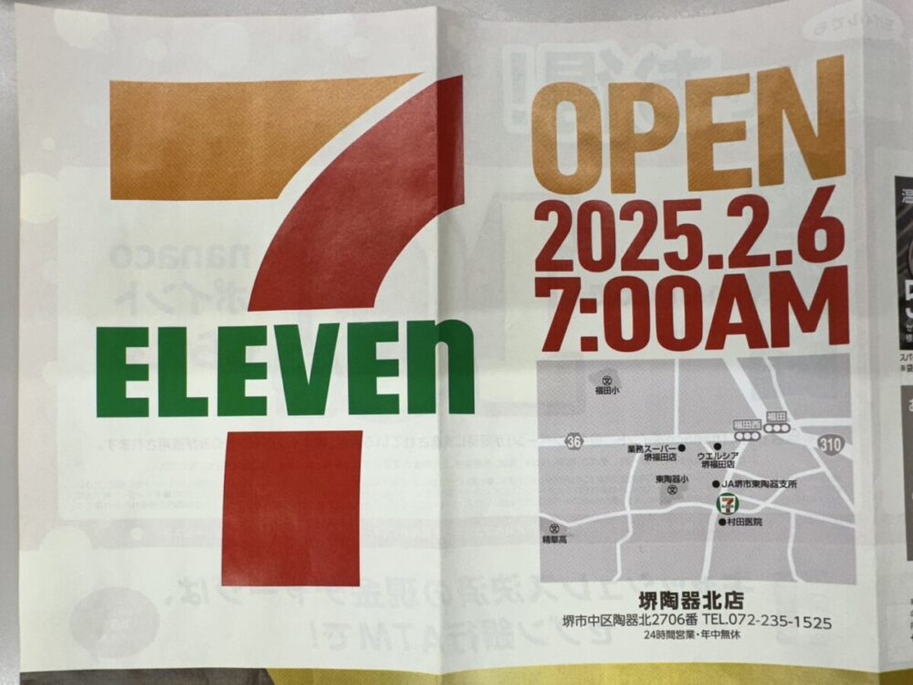 2025年2月6日(木)の午前7時、堺市中区陶器北に「セブンイレブン 堺陶器北店」がオープンしますよ♪