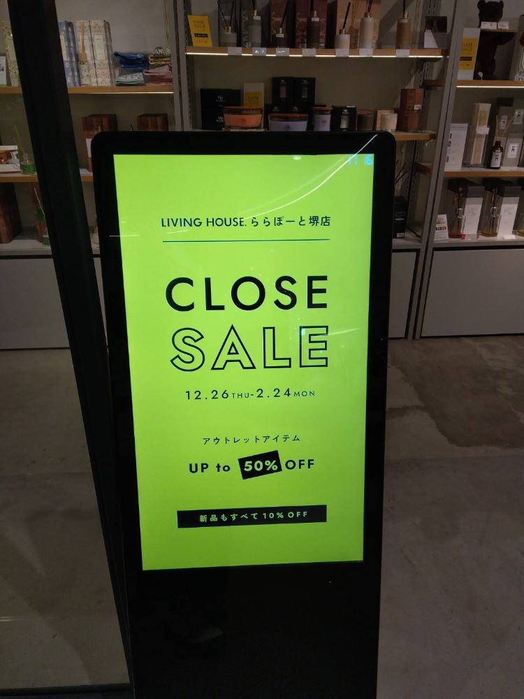 CLOSE SALEの看板が出ているのは、堺市美原区「ららぽーと堺」の1階にあるオシャレ雑貨と家具のお店『LIVING HOUSE. ららぽーと堺店 』