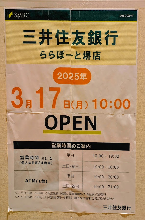 ららぽーと堺に三井住友銀行がオープンするようです!(^o^)
