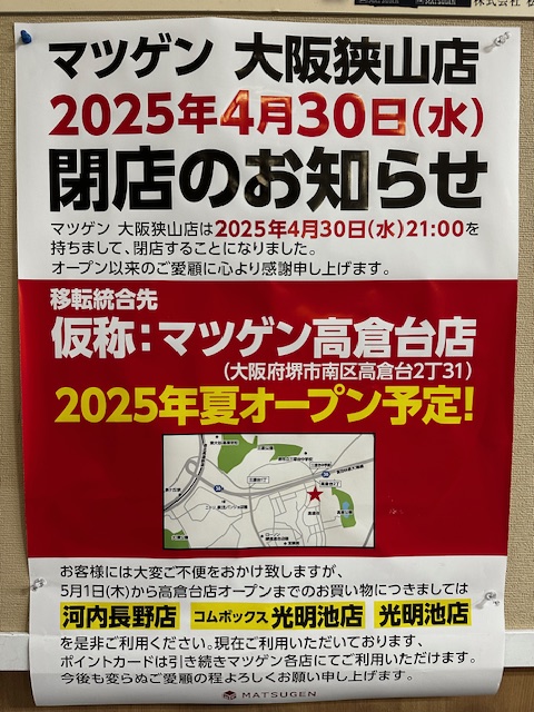2025年4月30日に大阪狭山市・大野台にある『マツゲン 大阪狭山店』が閉店するそうです。